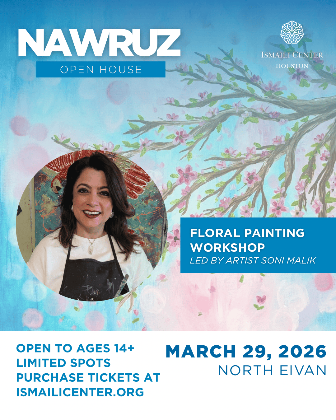 Join us for a special interactive painting session led by local artist Soni Malik. In celebration of Nawruz, the painting is inspired by new beginnings and growth. During the one hour session, participants will be guided by Soni Malik to create artwork that reflects the vibrant energy of the Spring season. Whether you’re an experienced painter or simply exploring your creative side, this unique experience blends art, culture, and stunning views from the North Evian of the Ismaili Center into an unforgettable artist experience. Limited seats are available for the two sessions held on March 29th. First session will begin at 11am and the second session at 12:30pm. Tickets are $20 and include all art supplies needed for the session. We hope you join us for this immersive experience to paint, connect, and be inspired by the beauty of nature.